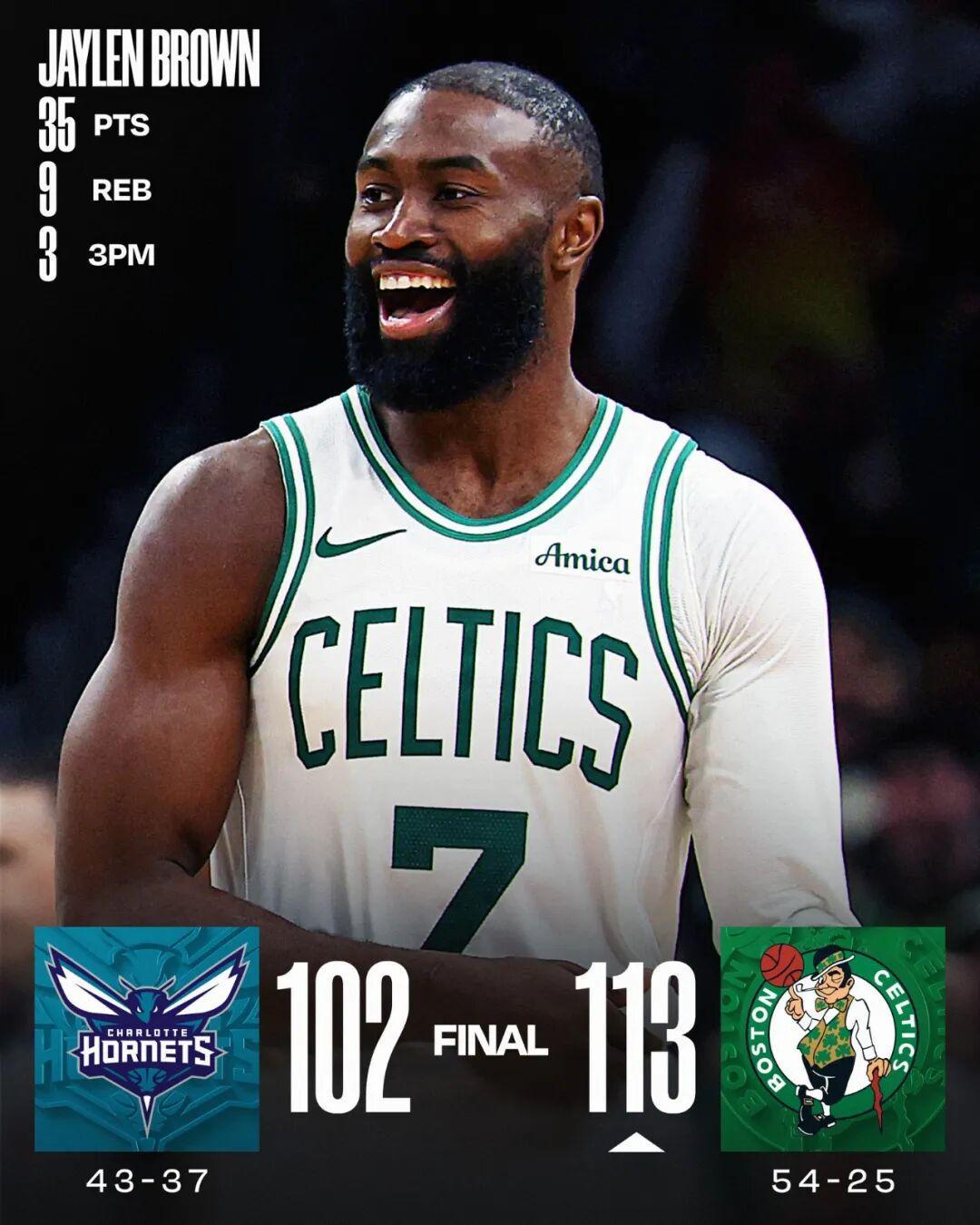 常规赛,凯尔特人主场113-102战胜黄蜂。